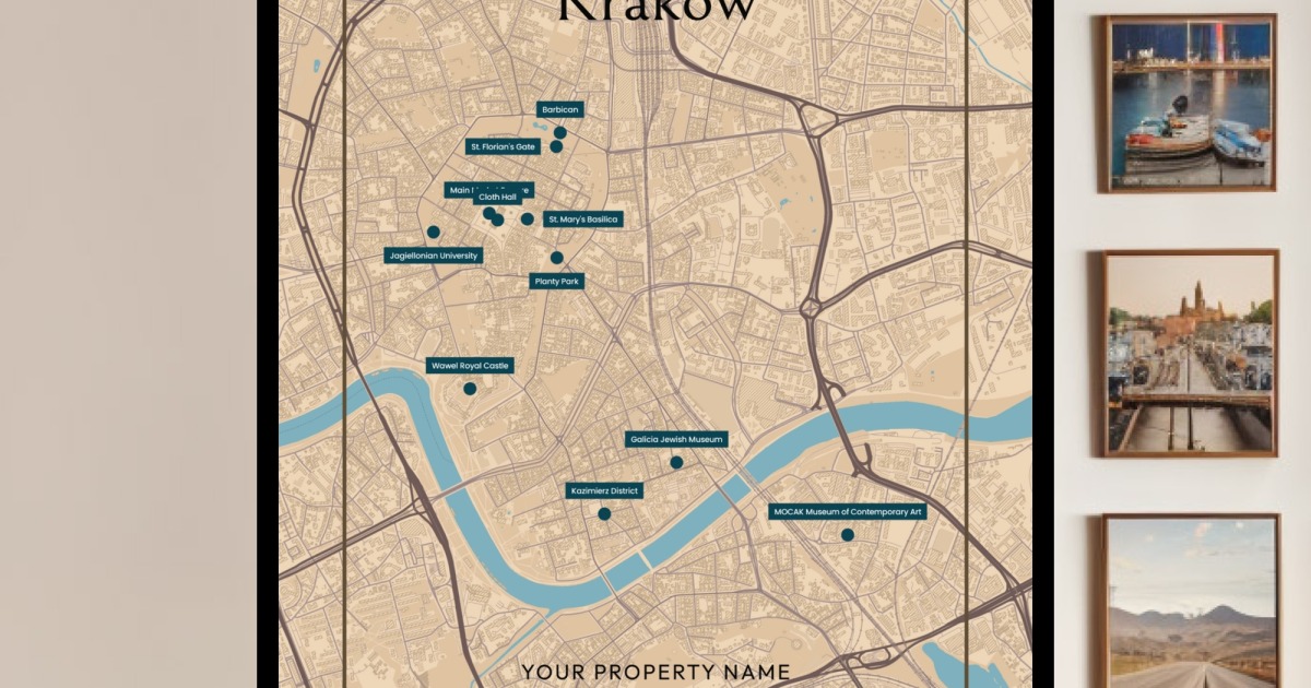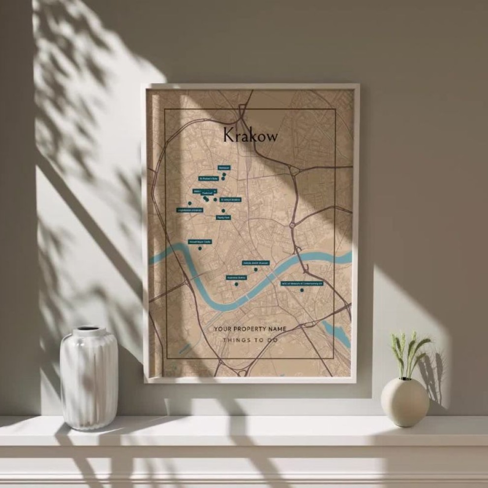 Our Krakow Airbnb Tourist Poster in Road Trip - Street Map is available in the always ideal Portrait orientation, or it can be fully customized to your liking. Perfect for any space, this work comes in various size options and finishing materials. In fact, your Krakow Airbnb Tourist Poster in Road Trip - Street Map will have a classic, gallery-quality look when you choose from Matte Poster, Metal Frame, Canvas, Wood Print, and more. Don't hesitate! Give your walls the makeover they deserve!