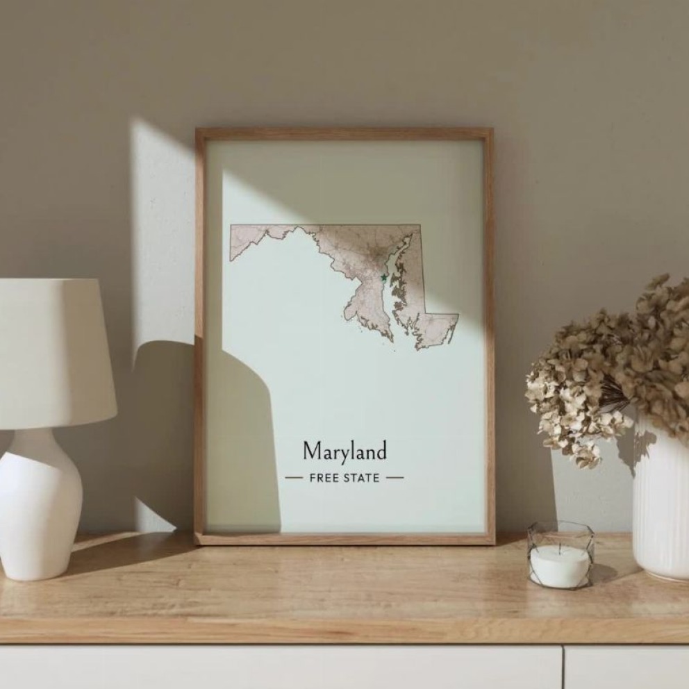 Our Maryland State Poster - Boundary Map is available in the always ideal Portrait orientation, or it can be fully customized to your liking. Perfect for any space, this work comes in various size options and finishing materials. In fact, your Maryland State Poster - Boundary Map will have a classic, gallery-quality look when you choose from Matte Poster, Metal Frame, Canvas, Wood Print, and more. Don't hesitate! Give your walls the makeover they deserve!